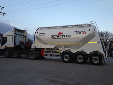 Алюминиевый цементовоз европейского качества от компании Oztreyler, выполнен из высокопрочного алюминиевого сплава толщиной 5 мм. Комплектация : оси - BPW (Германия), подвеска - пневматическая с передней подъемной осью, тормоза - дисковые, система ABS - Wabco (Германия), высота ССУ - 1200 мм., прицепной шкворень - 2 дюйма (евро-стандарт), два люка загрузки с четырьмя замками каждый, два конуса выгрузки с системой ускорения разгрузки, запорные клапана - пережимные AKO (Германия), рабочее давление 2 бара, два клапана сброса сброса давления 3 бара, возможна установка компрессора на заводе изготовителе.
